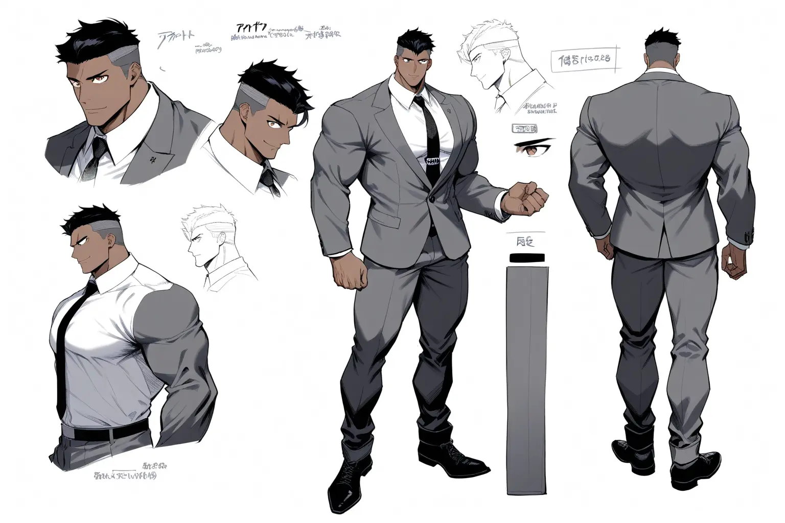 v3 でようやく「スーツを着た普通のビジネスパーソン」になり、v4 で表情集やディテールまで含む完成度の高いキャラシートができた。