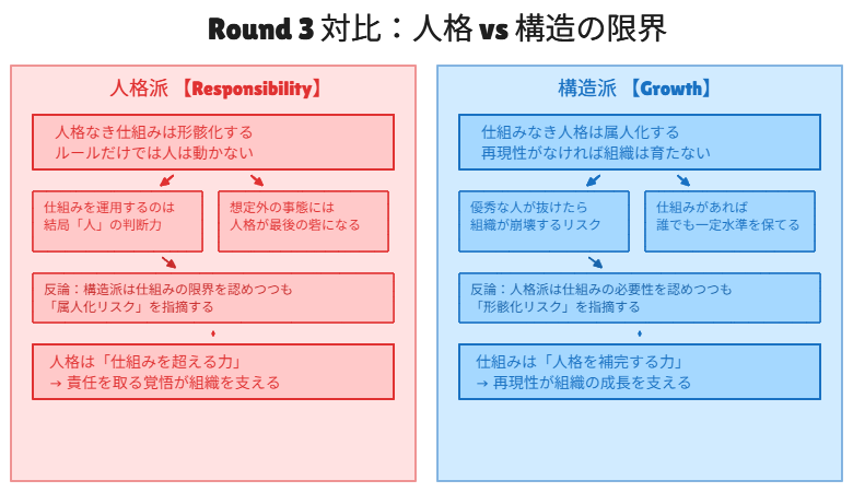 片方は「マネジメントの根幹は管理職の人格だ」と主張し、もう片方は「いや、論理的な仕組みこそが本質だ」と真っ向から反論する。どちらも YRGR の物語から根拠を引っ張ってきて、筋の通った議論を展開している。