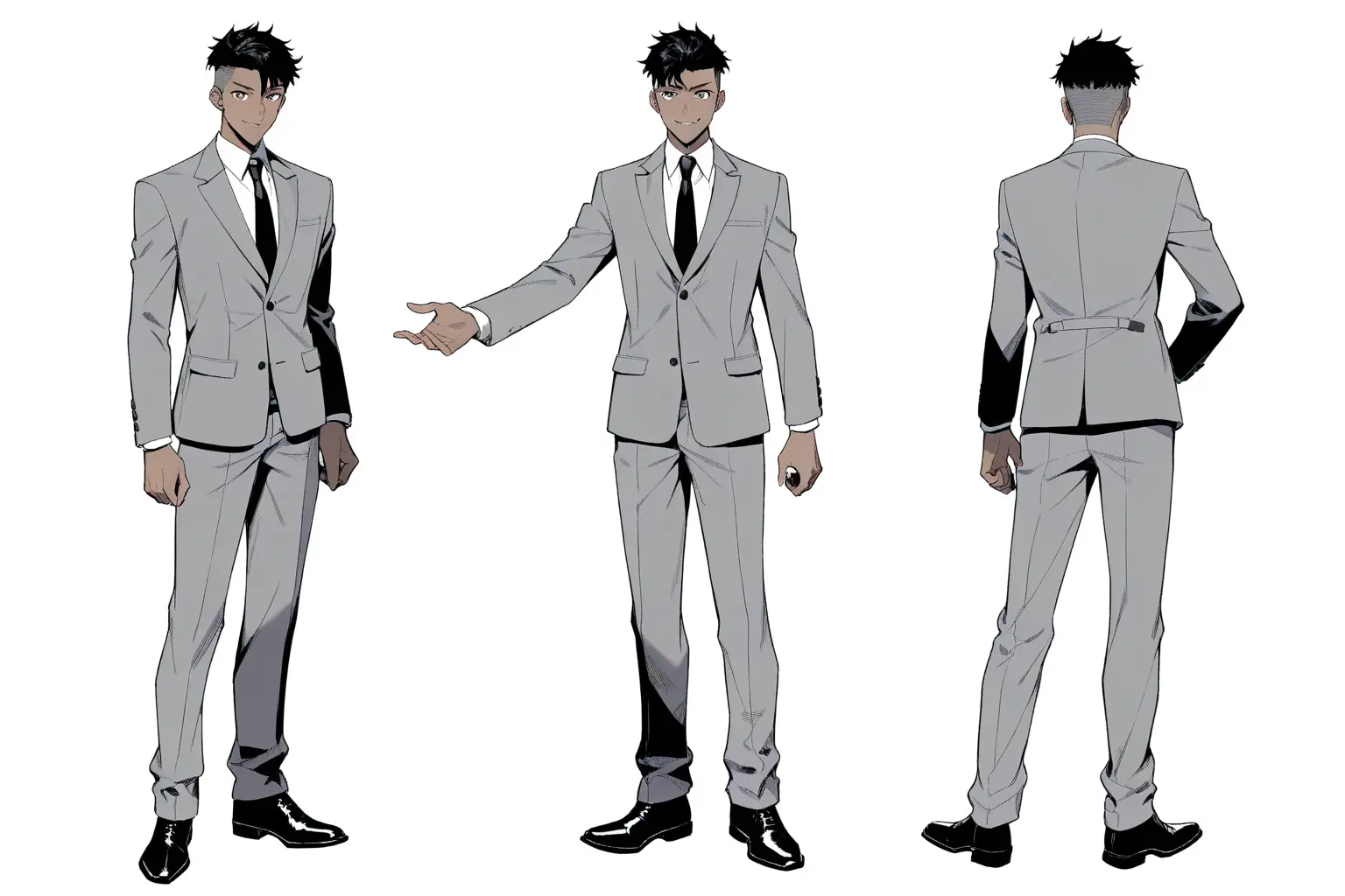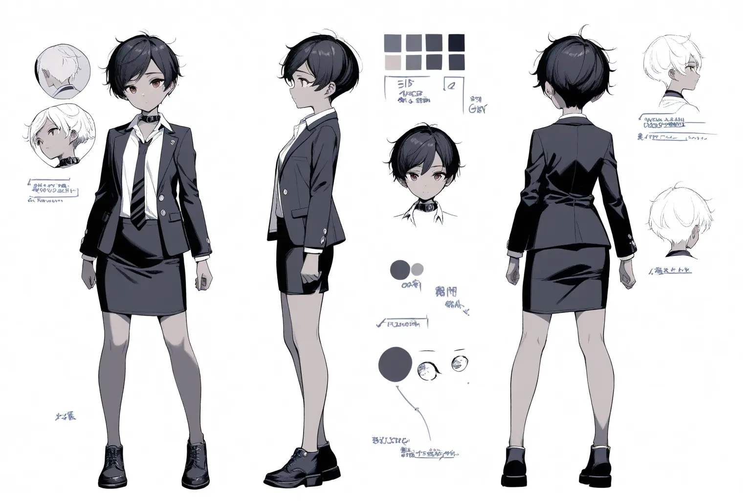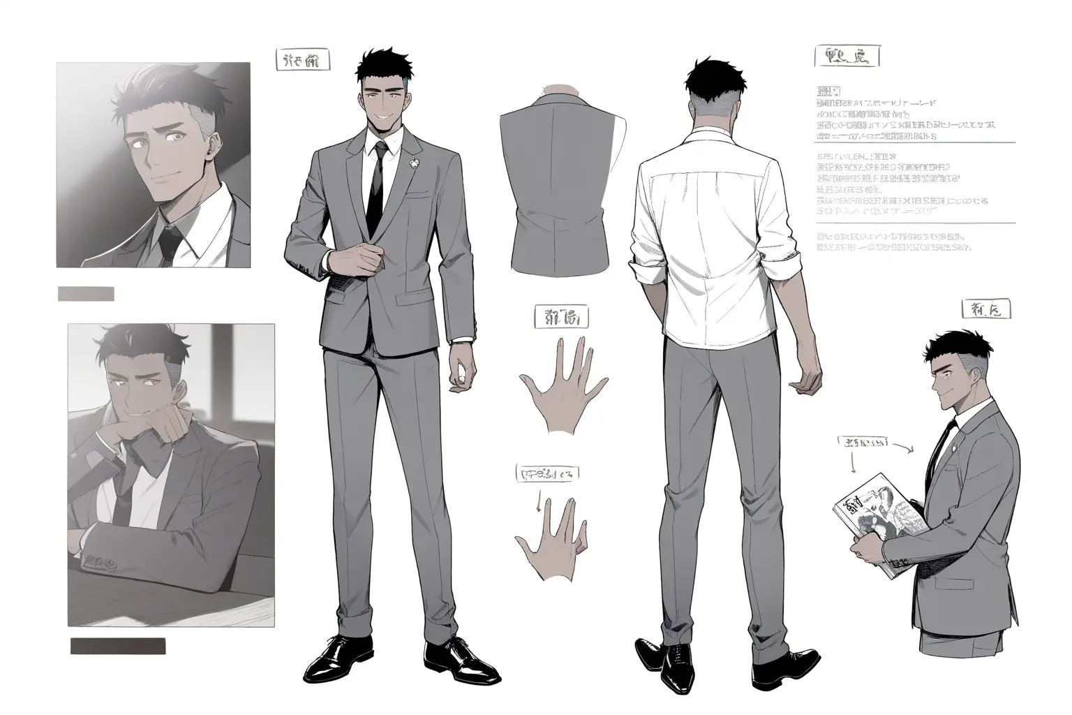v3 でようやく「スーツを着た普通のビジネスパーソン」になり、v4 で表情集やディテールまで含む完成度の高いキャラシートができた。