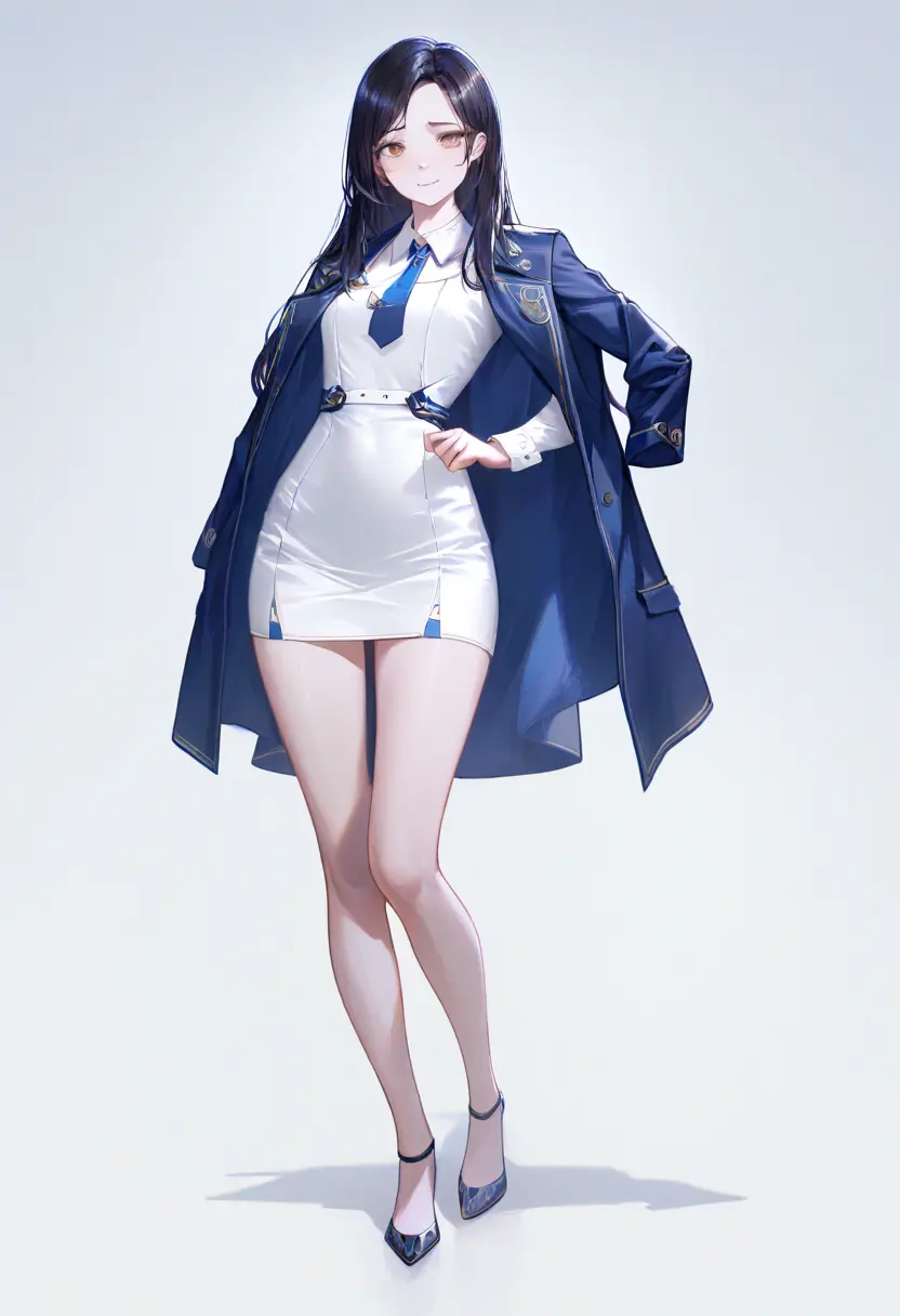 v1。ロングヘアにミニスカ、コートがはだけている。「ダークネイビーのスーツ」とプロンプトに書いたのに、出てきたのはセクシーなお姉さんだ。アニメモデルの学習データの偏りが、まっすぐ出ている。