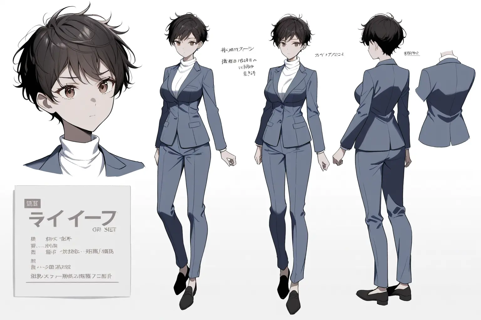 v5 でキャラシート形式(複数アングル)を出せるようになり、v7 で方向性が安定し、v9 でようやく「パンツスーツの凛とした若手ビジネスパーソン」にたどり着いた。