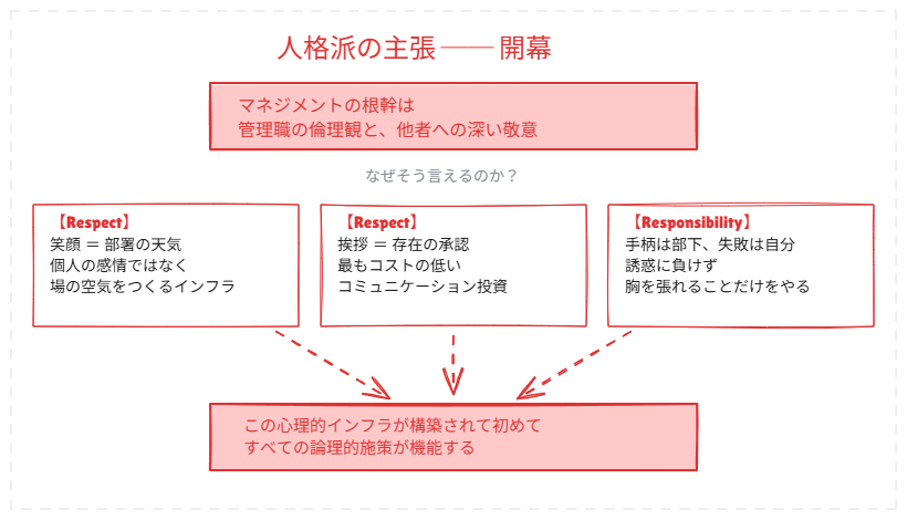 「管理職の笑顔は個人の感情ではなく、部署の天気をつくるインフラです。挨拶は礼儀ではなく、相手の存在を認めるという最もコストの低いコミュニケーション投資。手柄は部下のもの、失敗は自分のもの。——この心理的インフラが構築されて初めて、すべての論理的施策が機能するのです」
